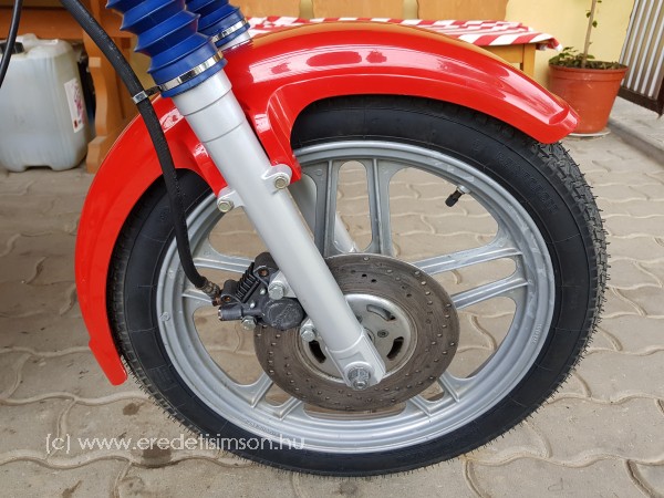 Újdonság az olasz Grimeca gyártmányú könnyűfém kerekek, elöl szintén ettől a gyártótól származó féktárcsa és a hozzátartozó féknyereggel,