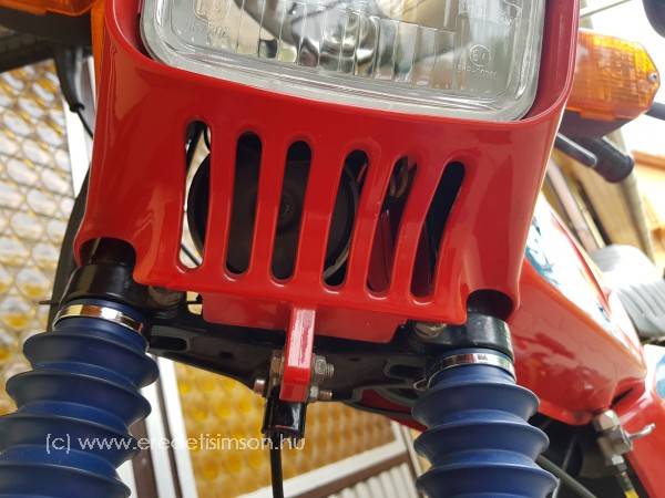 A HS1 izzós fejidom alján kapott helyet a FER gyártmányú kürt. Elegáns, jó minőségű krómozott gyűrűk tartják a helyükön a kék műanyag porvédőket.