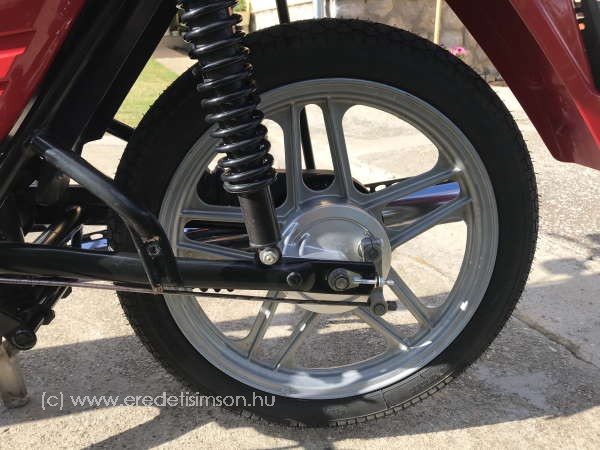 hátul is olasz dobféket és fékkulcsot találunk. Az alufelnire közvetlen rácsavarozták a lánckereket.