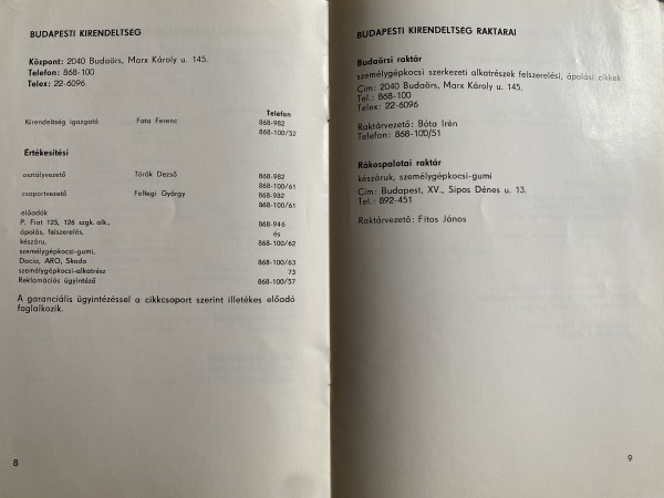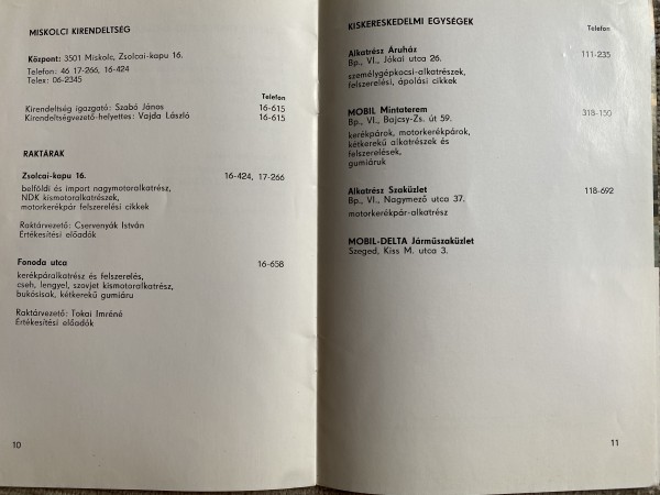 Következő érdekesség a raktárak, melyek közül a Zsolcai kapu 16 szám, itt tárolták a Simson alkatrészeket és felszereléseket, Cservenyák István volt ekkor a raktárvezető beosztásban. Mobil mintaterem volt még izgalmas ebben az időben a VI. kerületben Bajcsy Zs u 59 szám alatt.